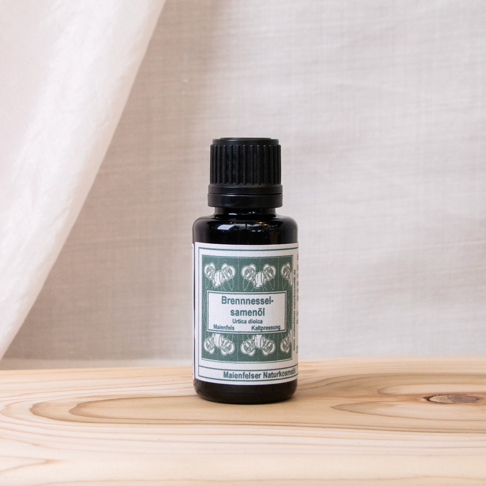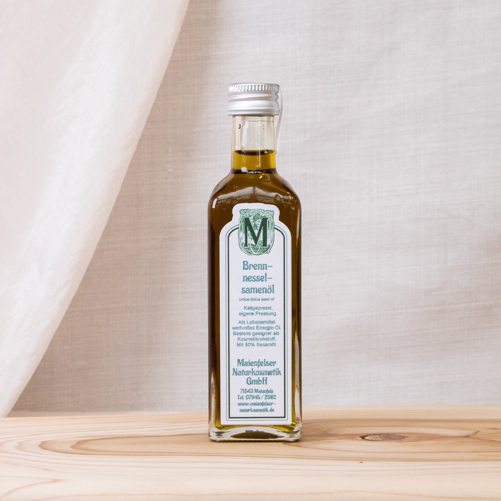 Die Brennnessel, ein leider viel geschmähtes Unkraut, steht dennoch hoch im Kurs der Kräuterkunde. Abgesehen davon, dass der Brennnesseltee sehr wohlschmeckend und sehr gehaltvoll ist und als eines der ersten Frühlings-Wildgemüse auch seine Berechtigung hat, ist das gepresste Öl aus den Samen ein wahrer Energieträger (Eisen, Magnesium etc.). Vor 2000 Jahren, vom griechischen Dichter Ovid als Aphrodisiakum gerühmt, stärkt Brennnesselöl hauptsächlich bei winterlicher Leistungsschwäche und Müdigkeit. Sichtbare Erfolge bei Antriebsschwäche und Lustlosigkeit. Das tiefdunkelgrüne Öl (Chlorophyll) lässt sich bei einer Kaltpressung nur sehr mühsam gewinnen. Dies erklärt auch den hohen Preis. Da das Öl pur so konzentriert und von der Konsistenz her wie ein Brei ist, verdünnen wir es ausnahmsweise mit biologischem Sesamöl 1:1. Trotzdem noch hoch konzentriert.
