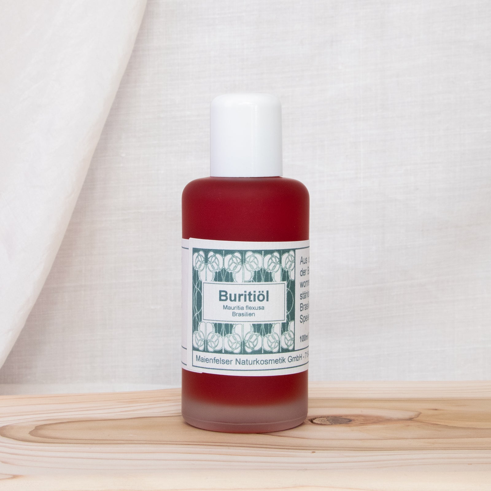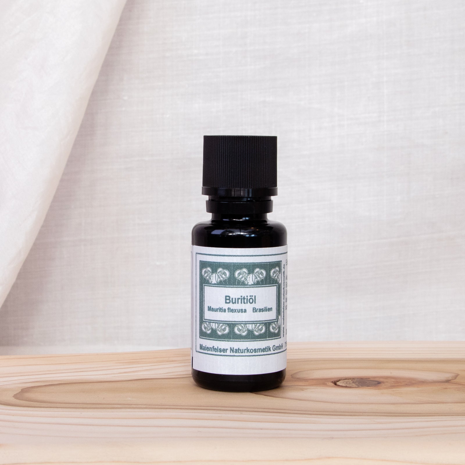 Tropische Palme aus dem Amazonasgebiet mit orange-braunen Früchten, die mit glänzenden Schuppen bedeckt sind. Das orange Buritiöl wird aus dem Fruchtfleisch gewonnen und zeichnet sich durch eine hohe Konzentration von Ölsäure, Tocopherolen (Vitaminvorstufen) und Carotinoiden, insbesondere B-Carotin, aus. Das Öl zählt zu den höchsten Quellen an natürlichen Beta-Carotin (5-fache der Karotte). Neuer Bestandteil unseres Sonnenöls. Bei den Einheimischen hat das Buritiöl den Ruf Schlangen-, Spinnen- und Skorpionbisse zu neutralisieren.
