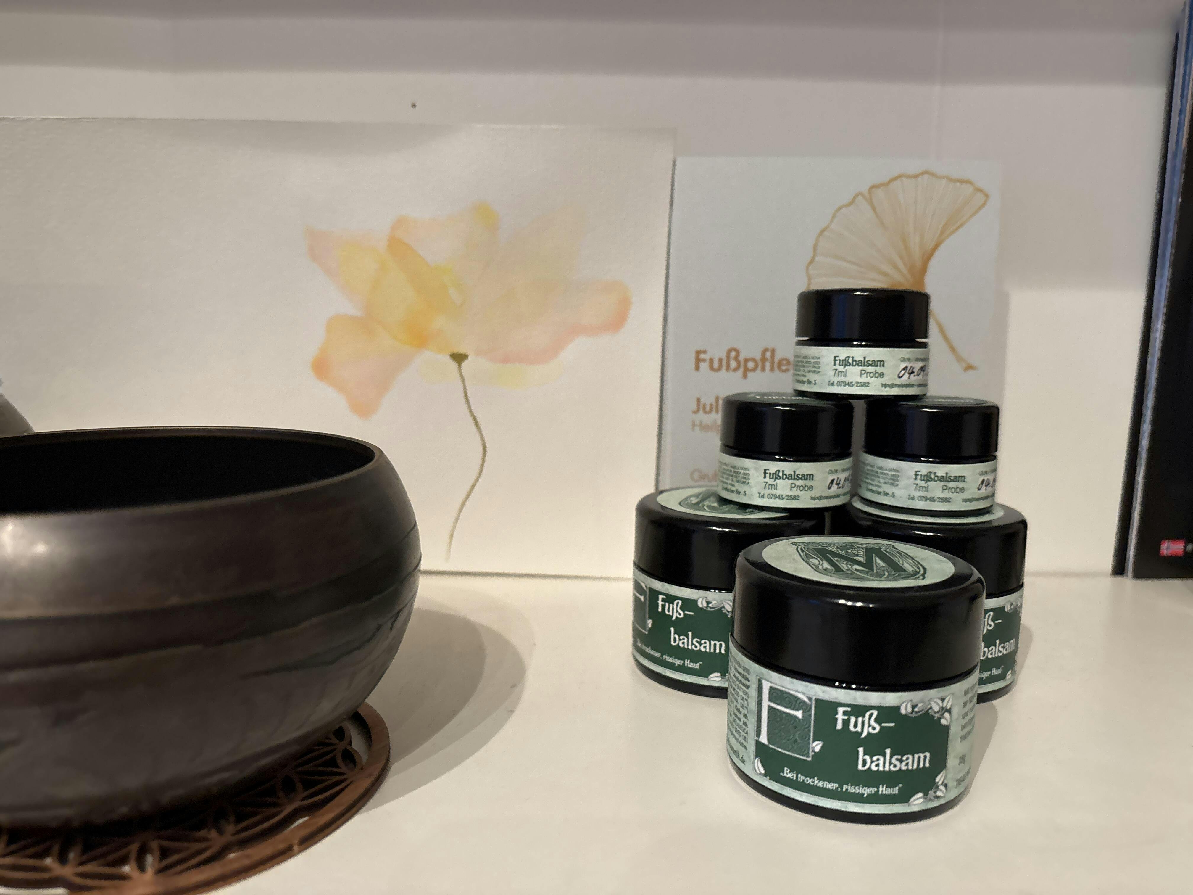 Zu unserer Walking-Fußpflegecreme kommt noch ein natürlicher Fußbalsam dazu. Dieser Fußbalsam ist gedacht für die schrundige, rissige und trockene Haut im ganzen Bereich der Füße. Sie ist eine Fettcreme und wirkt wohltuend mit ihren rein natürlichen Pflanzenölen und der ausgewählten Mischung der ätherischen Öle auf die Füße ein. Antibakterielle, antimikrobielle, antivirale und antifungizide Eigenschaft. Frischer aromatischer Kräuterduft.