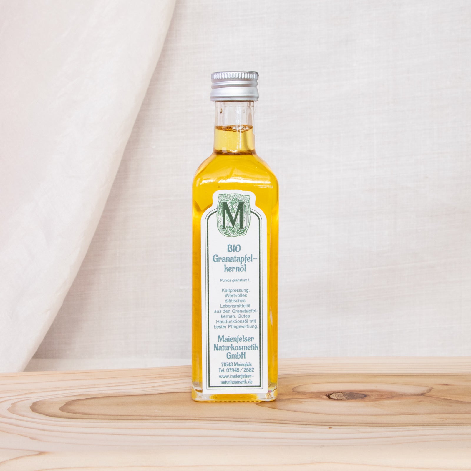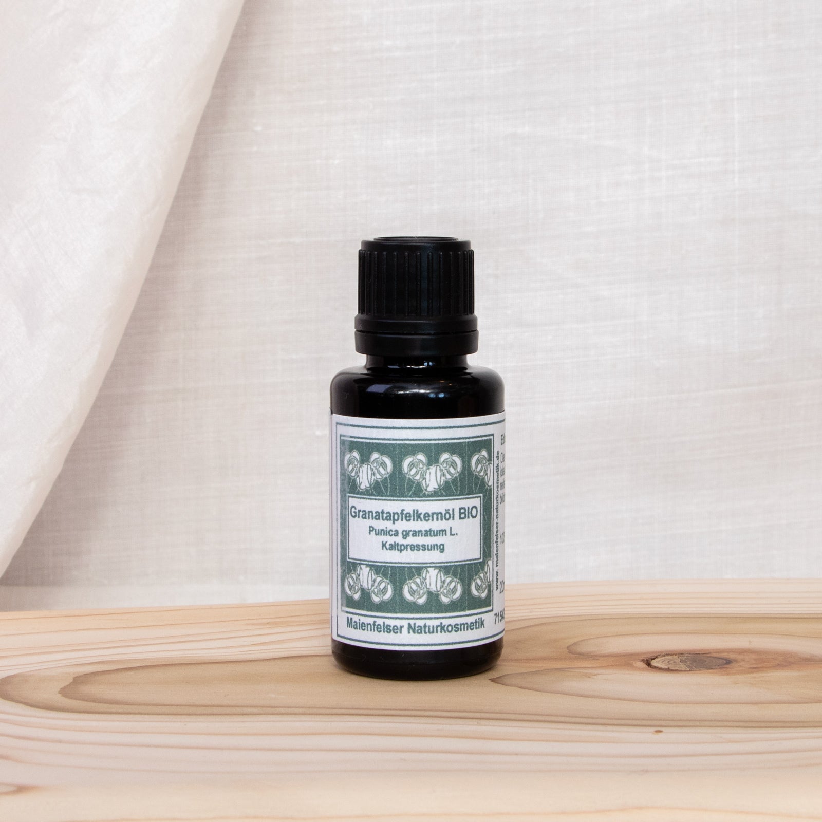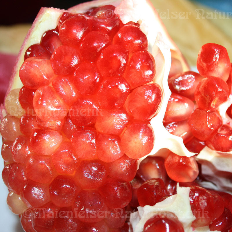 Der Granatapfelbaum kommt ursprünglich vor allem im südwestlichen Asien von der Türkei über den Iran, Syrien bis nach Indien vor. Heute sieht man ihn auch rund ums Mittelmeer. Die rote Frucht des Granatapfels beinhaltet zahlreiche erbsengrosse Samen mit roter Aussenschicht, die entweder kaltgepresst oder in CO2-Extraktion ein sehr wertvolles Öl ergeben. Das hellgelbe Öl hat einen lieblichen, leicht süßen Duft. Durch den hohen Anteil einer ungewöhnlich seltenen Ölsäure - der Pumicinsäure, die zu den mehrfach ungesättigten Fettsäuren (Omega 5) gezählt wird - zeigt das Granatapfelkernöl eine starke antioxidative Eigenschaft.