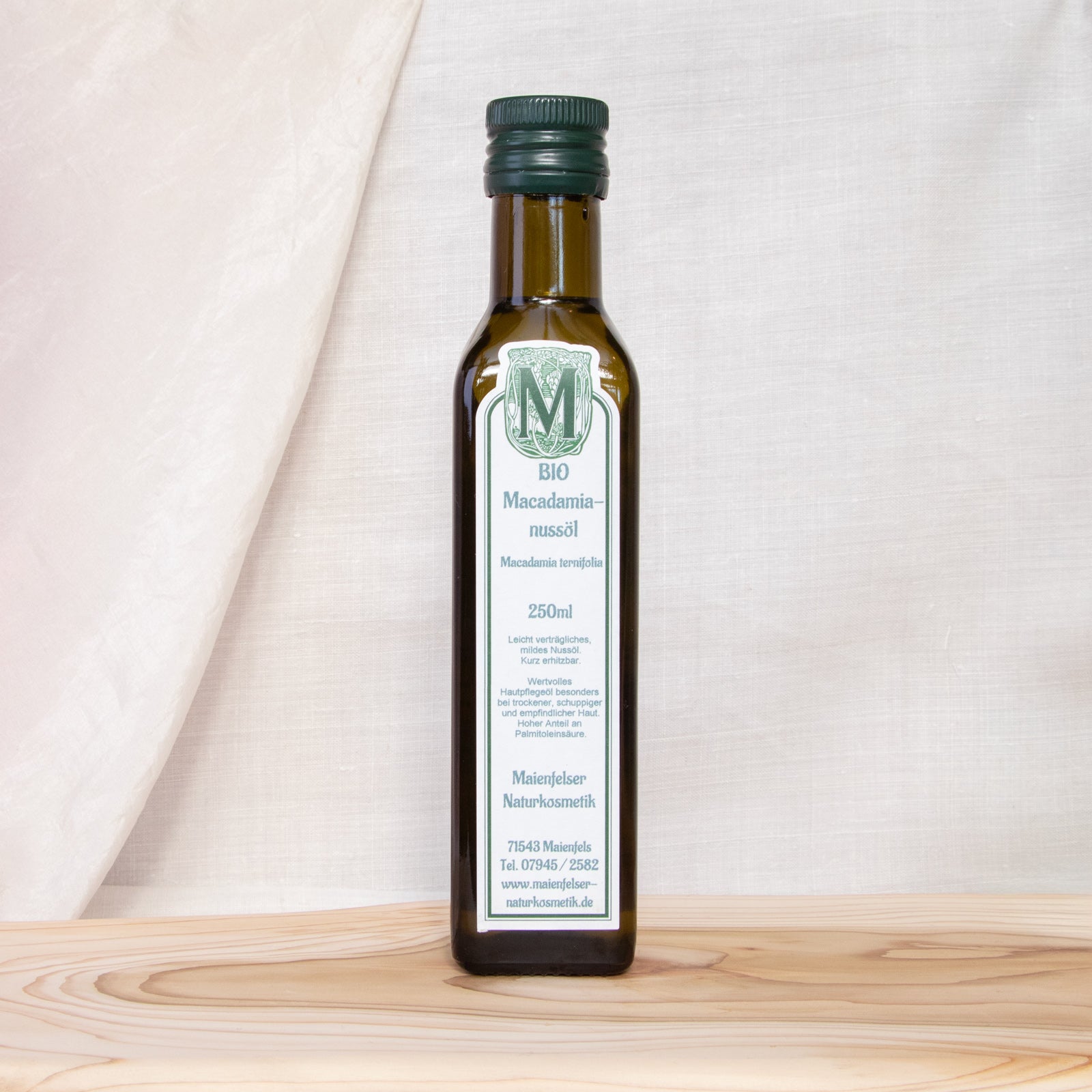 Der Macadamiabaum stammt vormals aus Australien, wird jedoch inzwischen auch in Hawaii, Neuseeland und Südafrika angebaut. Die Früchte, in denen die Nüsse vorhanden sind, haben eine extrem harte Schale, die vor der Pressung geknackt werden muss. Macadamianüsse zählt man zu der 'Königin der Nüsse', was natürlich auch für das daraus gewonnene Öl gilt. Es ist von seiner Ölsäurezusammensetzung her eine Besonderheit durch den enorm hohen Anteil von Palmitoleinsäure, einer ungesättigten Fettsäure, die sonst in nennenswerten Mengen nur in tierischen Fetten vorhanden ist (Nerzöl).