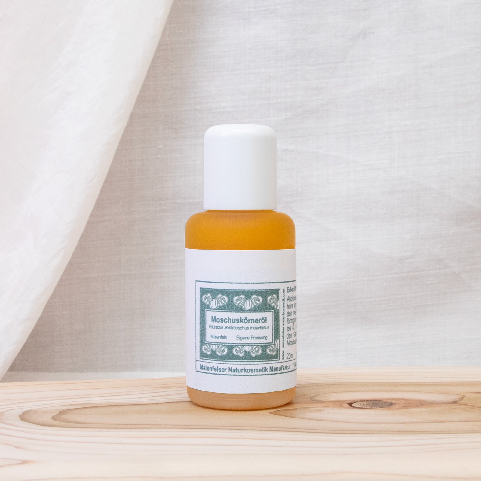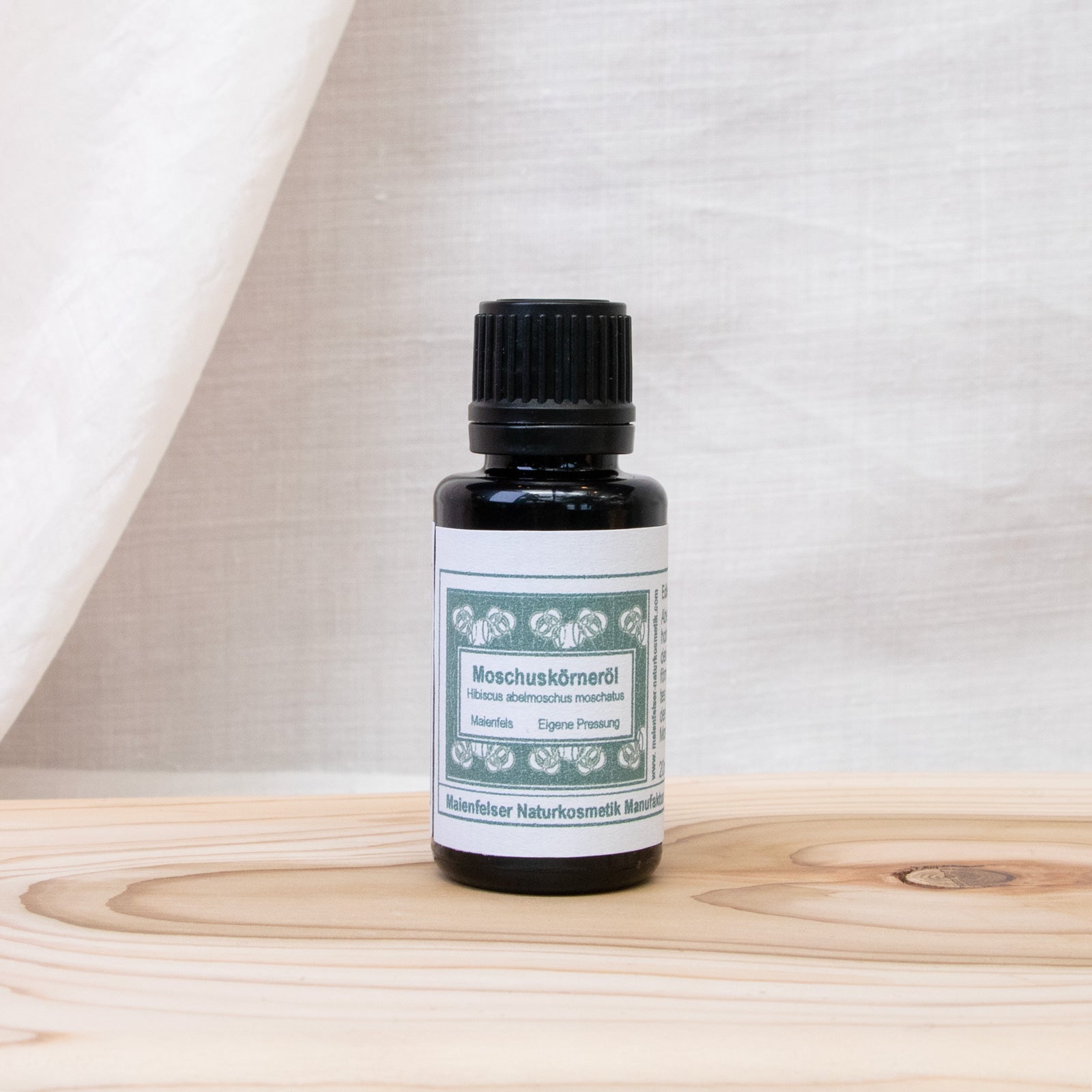 Abelmoschus-Moschatus-Arten sind bis zu zwei Meter hohe krautige Pflanzen mit gelben, zur Mitte hinlaufenden roten Blüten, die vorwiegend in Indien, Ägypten und auch auf Martinique wachsen. Aus den ca. 2 - 3 mm großen nierenförmigen, schwarzbraunen Samen pressen wir ein fettes Öl mit 'moschusartigem' Duft. Nicht verwechseln mit dem ätherischen Öl aus diesen Samen, das aus Wasserdampfdestillation/Extraktion gewonnen wird und zu den teuersten ätherischen Ölen zählt (siehe ätherische Öle unter Moschuskorneröl). Das fette, gepresste Öl ist eine Alternative zum ätherischen Öl. Der Duft ist balsamisch, mystisch moschusartig, erdig, tierisch und pur oder als Zusatz zu einem Körperöl verwendet, bereichert es eine Duft-Kreation mit dem balsamischen, aphrodisischen Basisduft. Wir verkaufen Ihnen das Moschuskörneröl pur, ohne jeglichen Zusatz eines anderen fetten oder ätherischen Öls. Eine optimale Alternative auch zu den synthetischen polyzyklischen Moschusverbindungen, die weltweit als billigste Duftzusätze in Waschmitteln, Seifen, Parfüms, Putzmitteln etc. ihre schreckliche Duftpräsenz verbreiten, sich im menschlichen Fettgewebe und in der Muttermilch anreichern und nicht einmal in Kläranlagen abgebaut werden können.