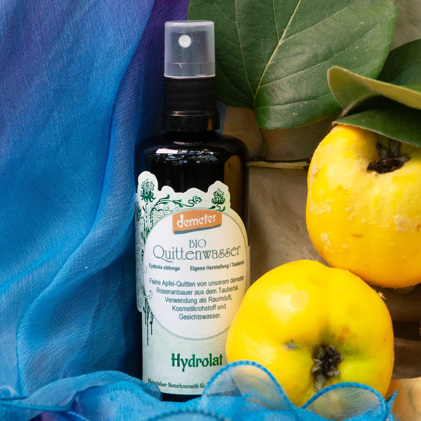 Unser Quittenbaum verwöhnt uns im Herbst mit seinem arttypischen Duft. Wir verarbeiten die Früchte als Marmelade und legen noch etliche Früchte auf die Fensterbank um noch lange dieses Aroma zu genießen. So entstand auch die Idee es doch mal mit einer Destillation zu versuchen. Nicht um einen Quittenschnaps zu gewinnen, sondern das reine Hydrolat der Früchte mit dem Wunsch, das Aroma vielleicht länger zu genießen als die Früchte haltbar sind. Es war natürlich die Frage, ob dies mit einem Hydrolat überhaupt möglich ist. Das Ergebnis hat uns begeistert. Deswegen, auch zu einer Quittenlosen Zeit können wir Ihnen in begrenzter Menge das Aroma der Quitten präsentieren.
