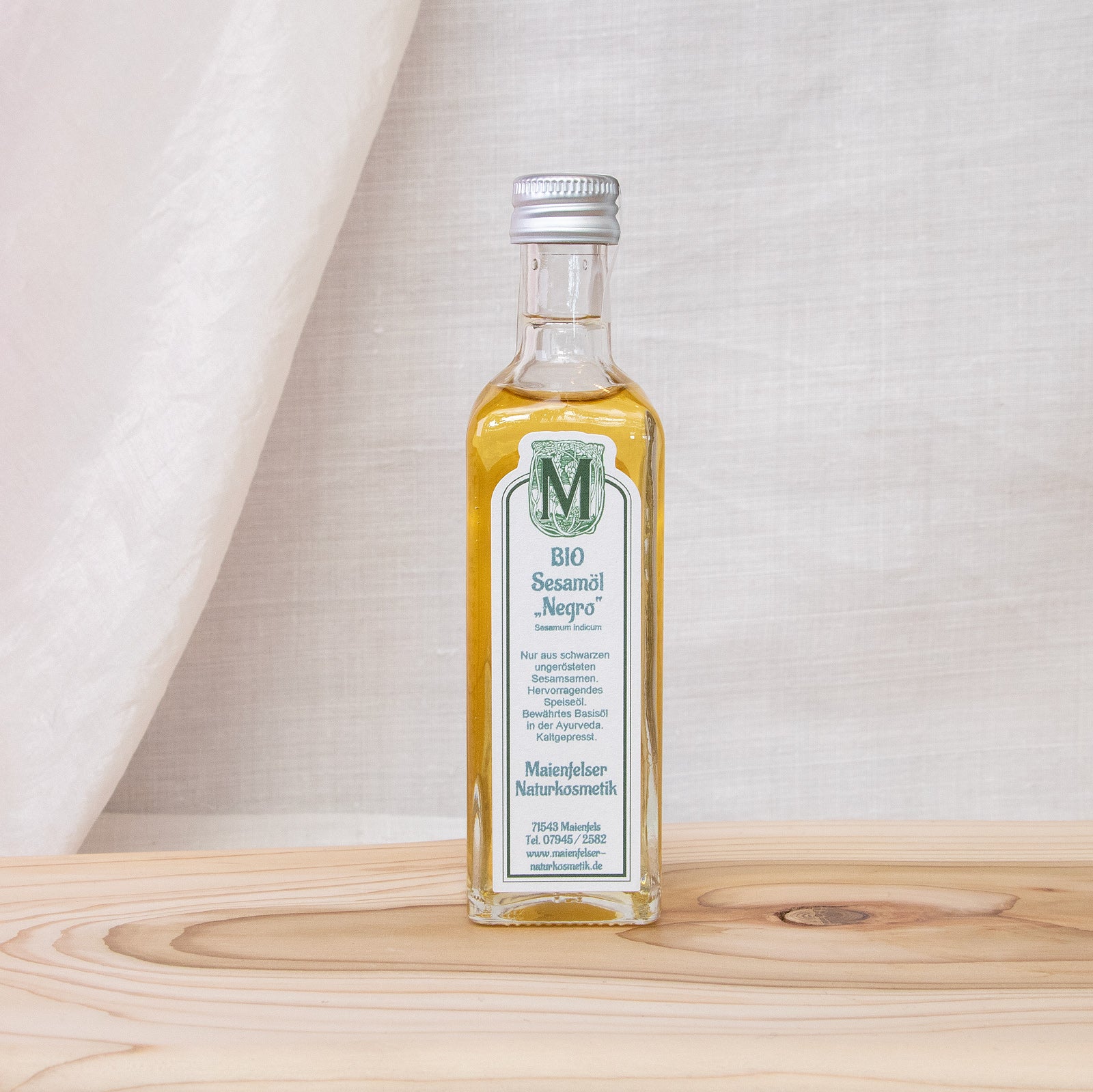 Der schwarze Sesam gilt als die Urform des Sesams. Noch in ursprünglicher Art in Nepal kontrolliert biologisch angebaut, wird das Öl hier in Deutschland kaltgepresst. Der schwarze Sesam gilt als der energiereichste mit einem Maximum der gespeicherten Lichtenergie. Mit seinen wertvollen Inhaltsstoffen ist das Öl ein schon seit dem Altertum verwendetes Massageöl zur Entgiftung, Straffung und zum Schutz und zur Pflege der Haut.