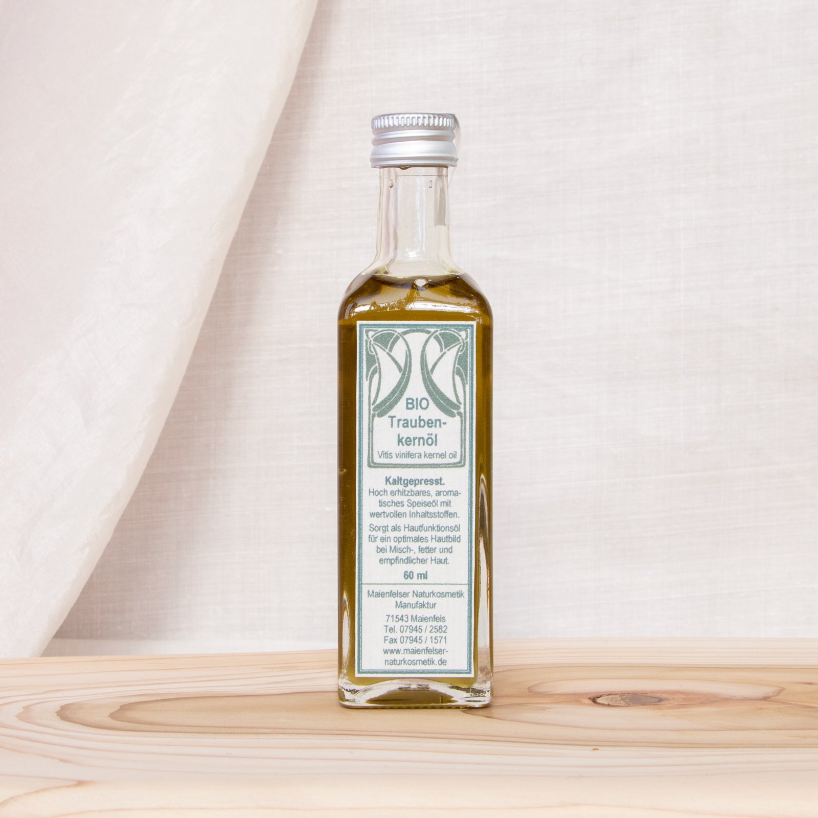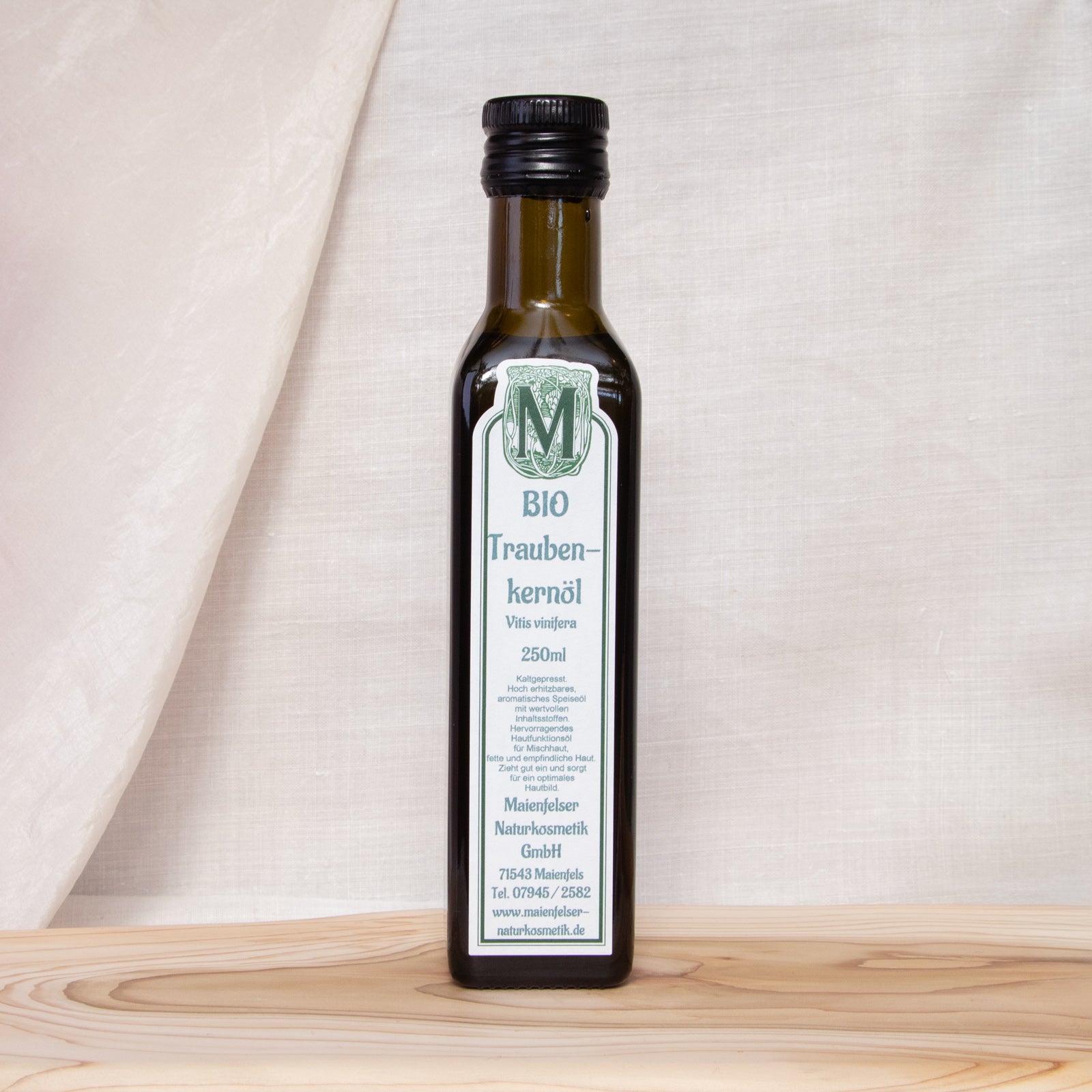 Kosmetische Verwendung: Traubenkernöl dringt gut in die Haut ein und macht das Bindegewebe aufgrund der oben genannten Wirkstoffe elastisch und sorgt für ein optimales Hautbild, ohne einen Fettfilm zu hinterlassen. Es hat regenerative, zellmembranschützende und feuchtigkeitsspendende Eigenschaften und ist demzufolge auch ein wichtiger Bestandteil in Sonnenschutzprodukten. Traubenkernöl ist das geeignete Hautfunktionsöl für Misch-, fette und empfindliche Haut. Zu erwähnen wären noch die guten Eigenschaften als Trägeröl für ätherische Öle.